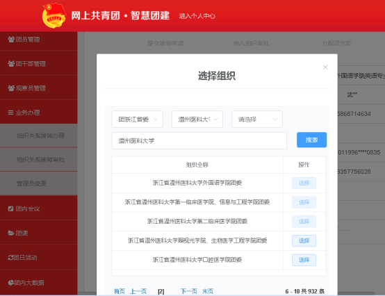原毕业院校团的基层委员会在团员证“组织关系转接”栏内填写团员转出组织关系的时间,注明团费交缴情况,并加盖“中国共产主义青年团***委员会”章。同时登录“智慧团建”系统,点击业务办理,将团组织关系转入太子娱乐城 拟录取学院所在团委(创新创业教育学院转入“机关团总支”,台州医院拟录取考生转入“共青团浙江省台州医院委员会”,卓越中心拟录取考生转入“眼视光学院、生物医学工程学院团委”),具体为“选择组织”里依次选择“团浙江省委”,“太子娱乐城 ”(或“台州医院”),“浙江省太子娱乐城 XX学院团委”(“机关团总支”或“浙江省台州医院委会”)。