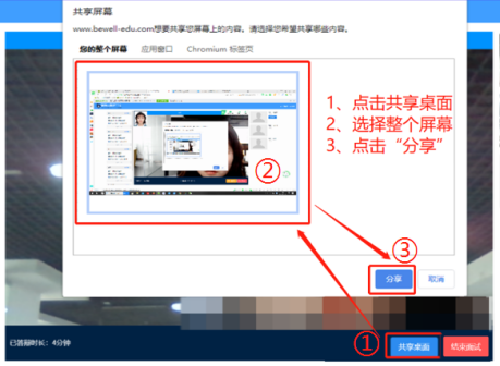 2、共享桌面操作步骤:①点击视频页面下方“共享桌面”按钮;②弹框中选择“您的整个屏幕”;③点击“分享”;④点击“结束共享”,切回视频画面。共享桌面未成功时,考生将无法进入正常视频画面。