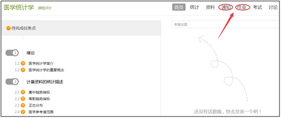 6、在课程学习主页中,页面右上方菜单栏设有课程相关信息选项,根据选项了解相关通知、课前课后讨论等。