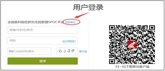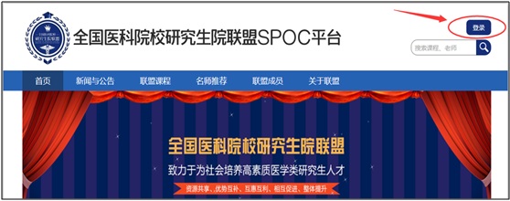 1、 登陆全国医科院校研究生院联盟SPOC平台//yjsylm.fanya.chaoxing.com/portal,点击登录。